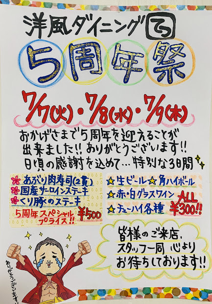 おかげさまで、洋風ダイニングてつは明日7/1で5周年を迎えることができます!!