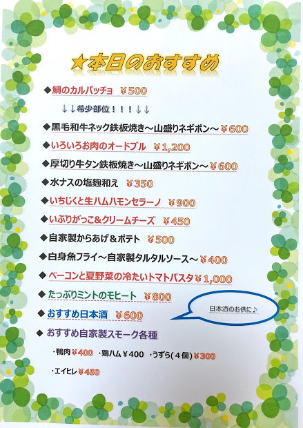 阪急石橋阪大前駅のイタリアン、洋風ダイニングてつ『本日のオススメ♪』
