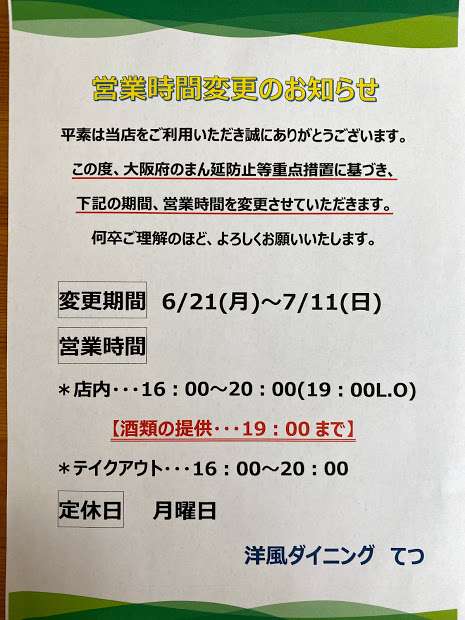 この度、大阪府のまん延防止等重点措置に基づき、下記の期間、営業時間を変更させていただきます!